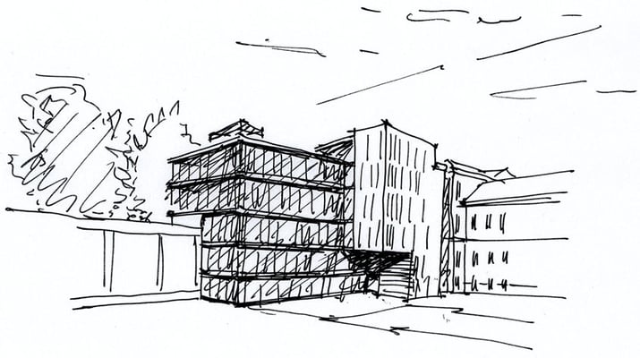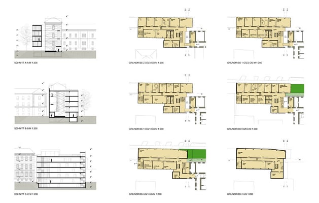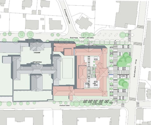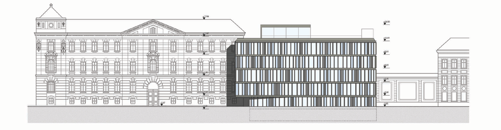 Design entered in the competition for an addition to an already existing court building in St. Pölten. The proposed extension takes up both the existing streetside section of the neighbouring prison and the section of the facade of the court building. The staircase has been created at the place where these two already existing sections meet, thus forming an open atrium which connects all the storeys of the old and new buildings. With its cornices, the new volume is approx. 2 metres lower than the existing building, yet it overlaps the old building as a new protruding architectural element.