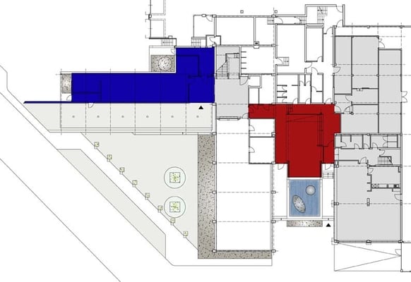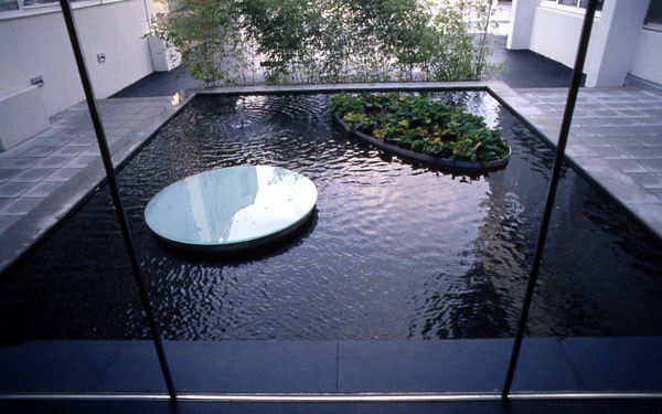 New construction of offices and a canteen as a connecting element between two existing office sections. Design of an accompanying courtyard area with pond, as well as an island with plants and and another one with lighting.